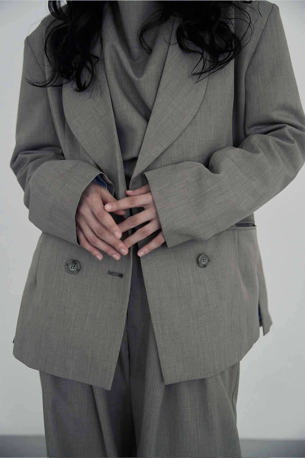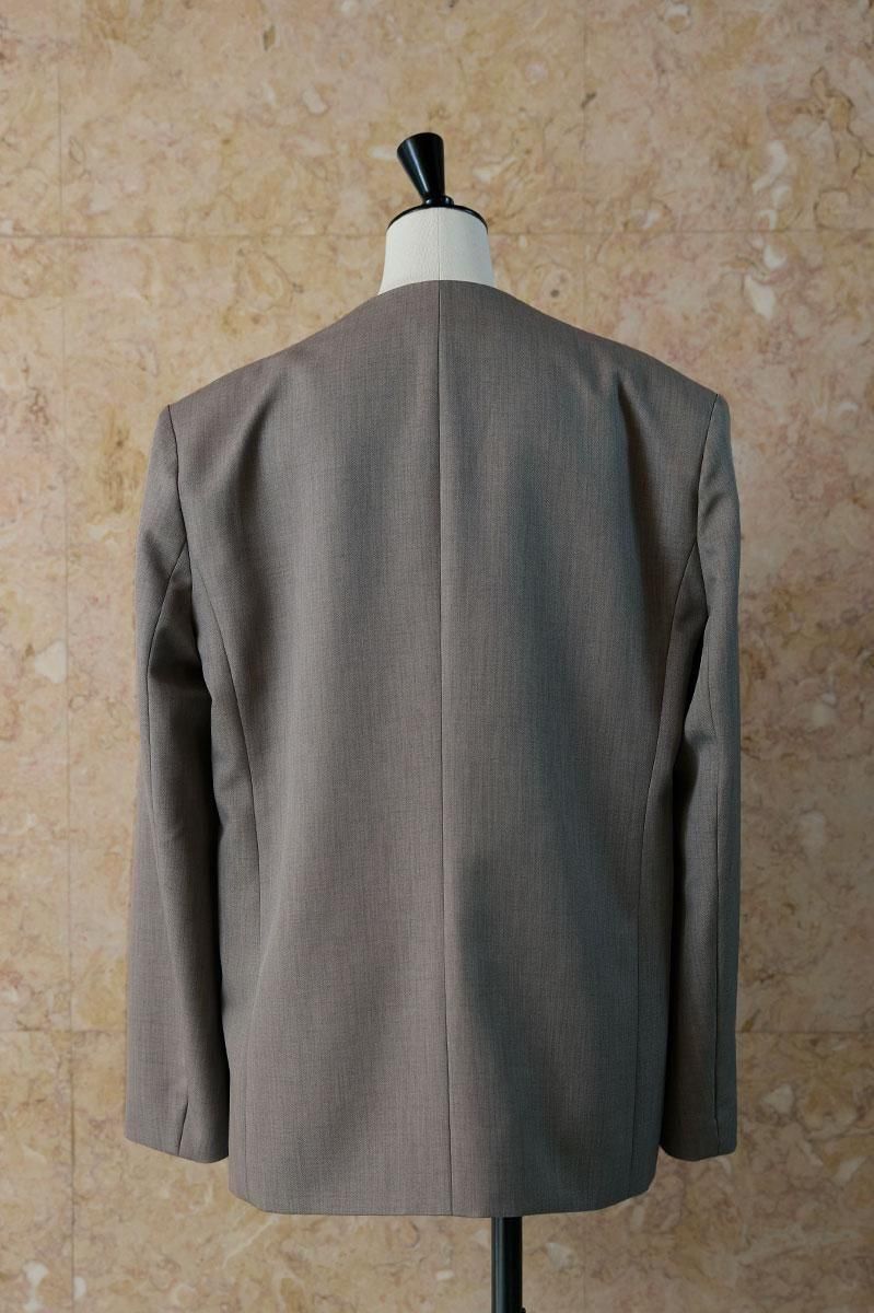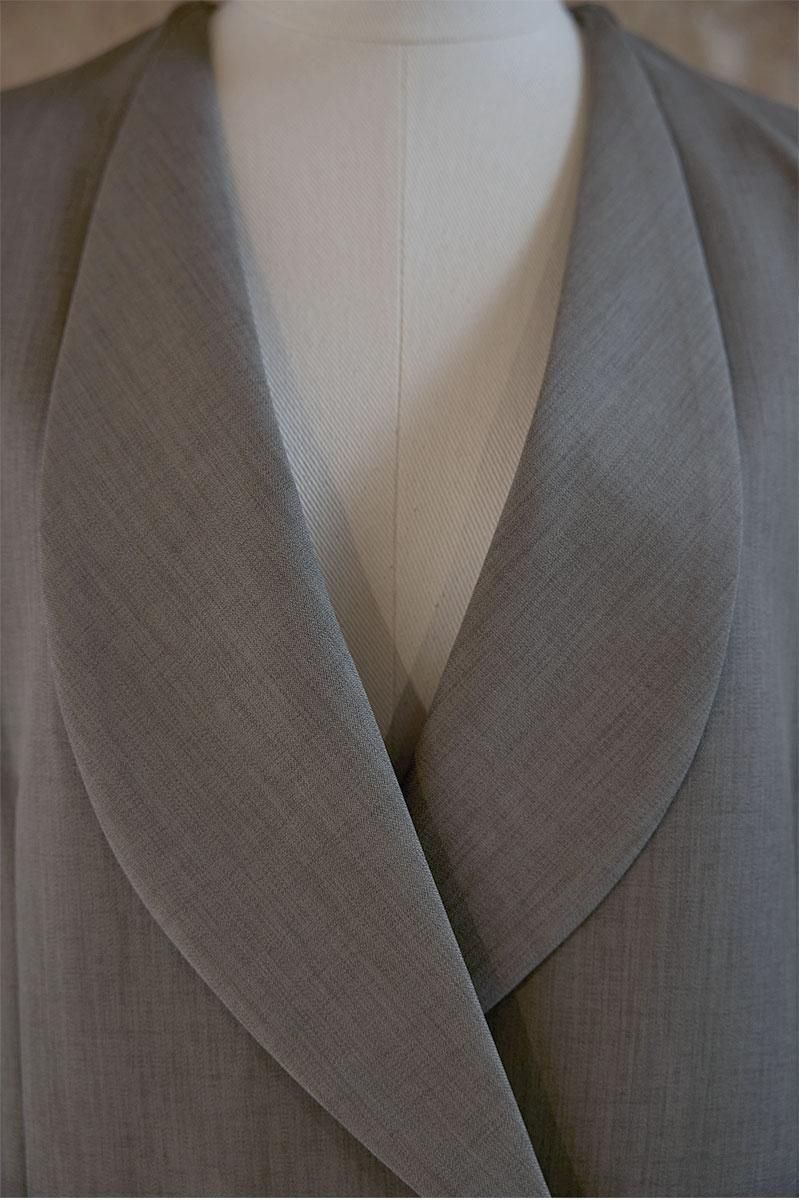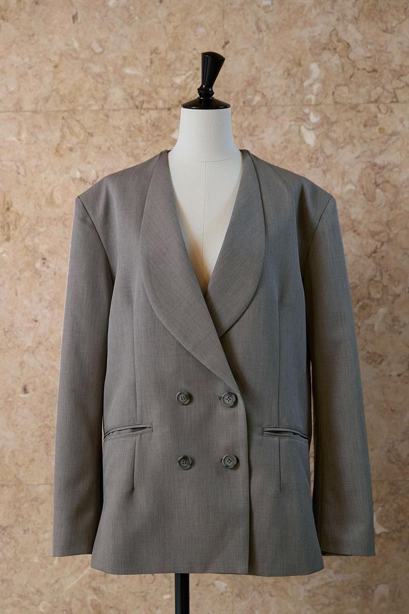 曲線が美しいショールカラーの様な柔らかな襟にすっきりさせたノーカラーが特徴のDOUBLE TAILORED JACKET