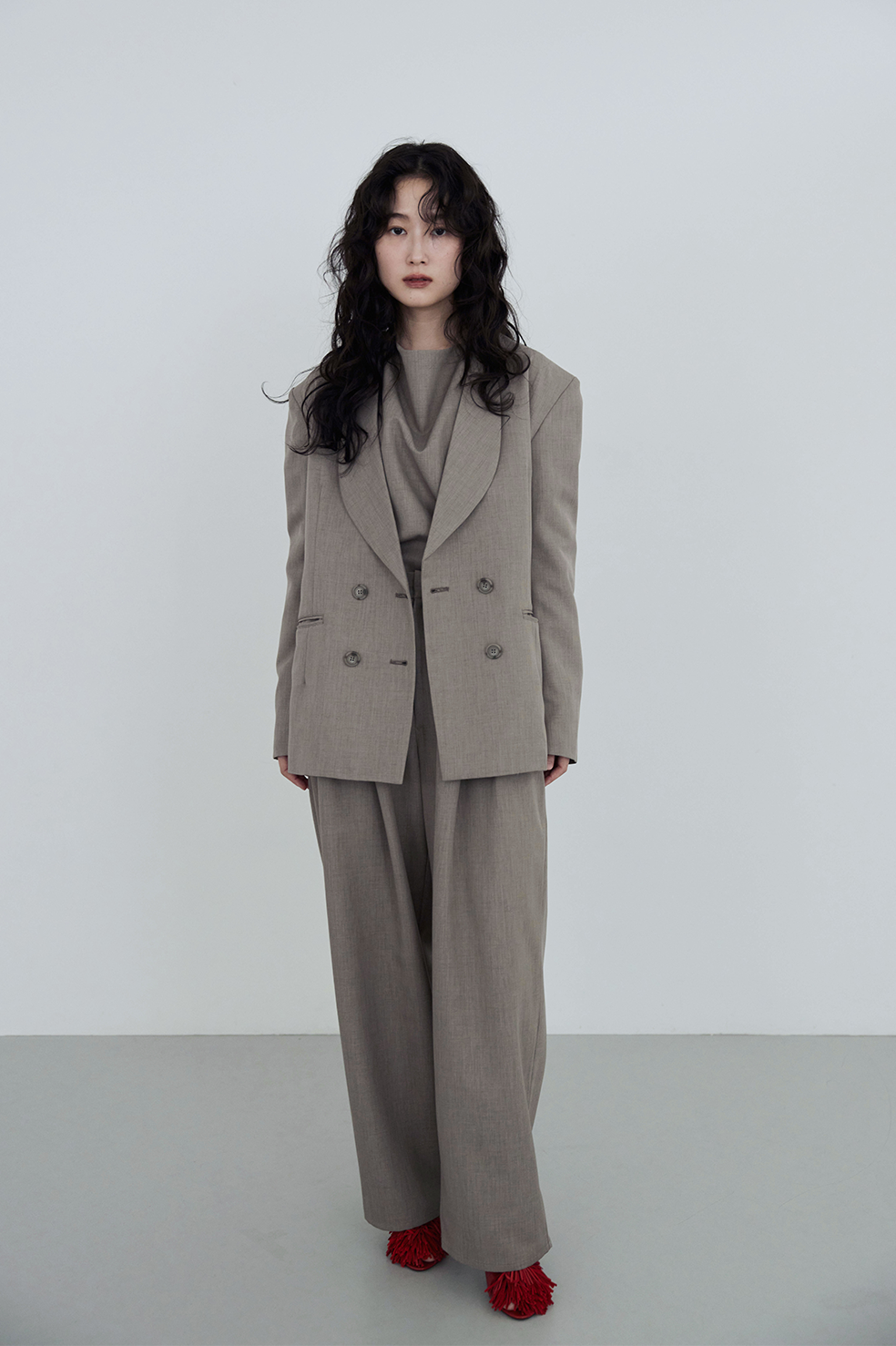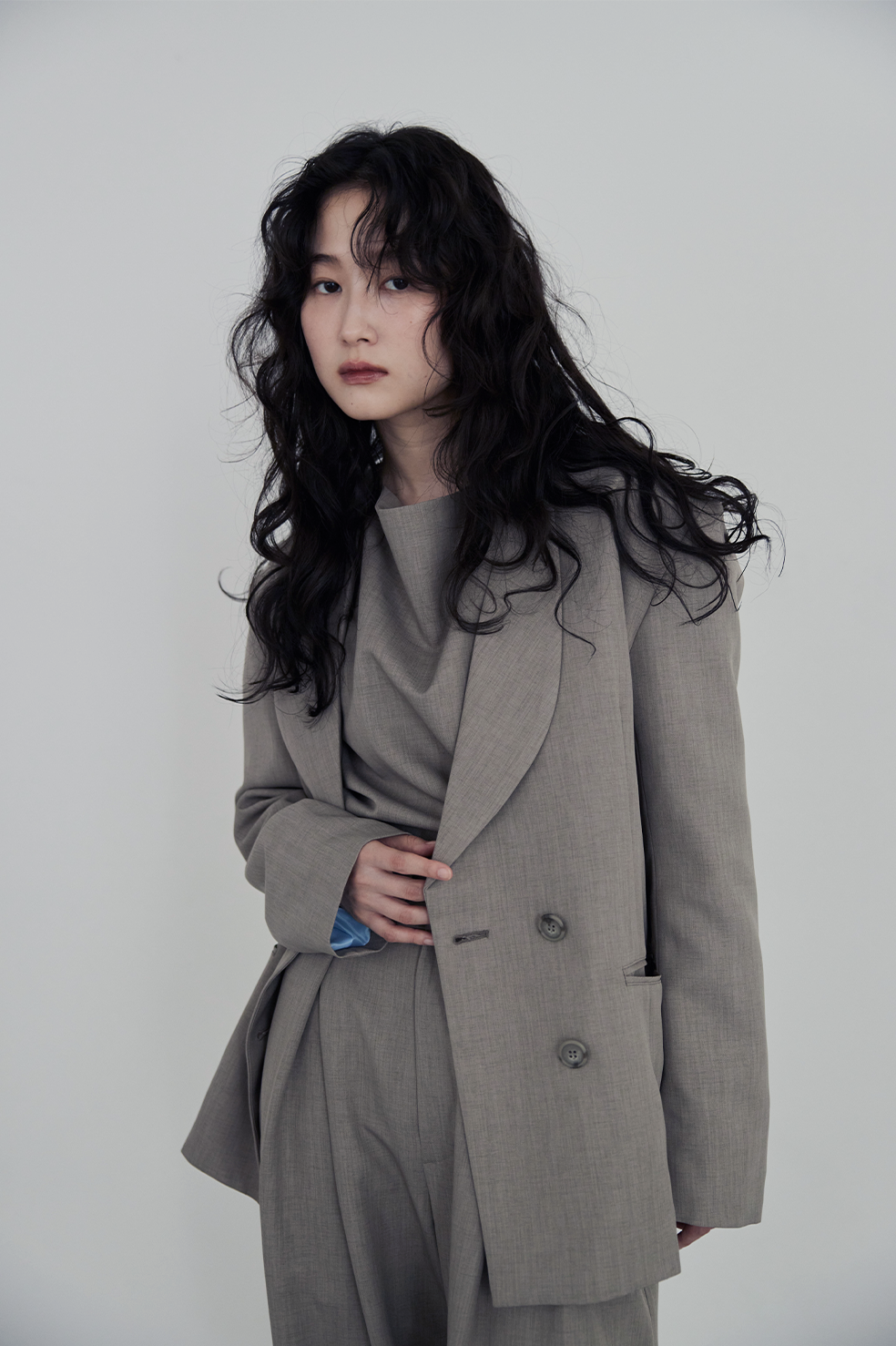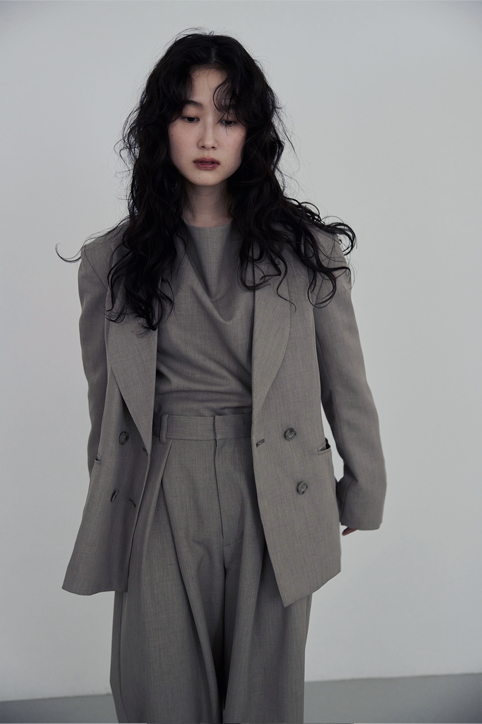 曲線が美しいショールカラーの様な柔らかな襟にすっきりさせたノーカラーが特徴のDOUBLE TAILORED JACKET