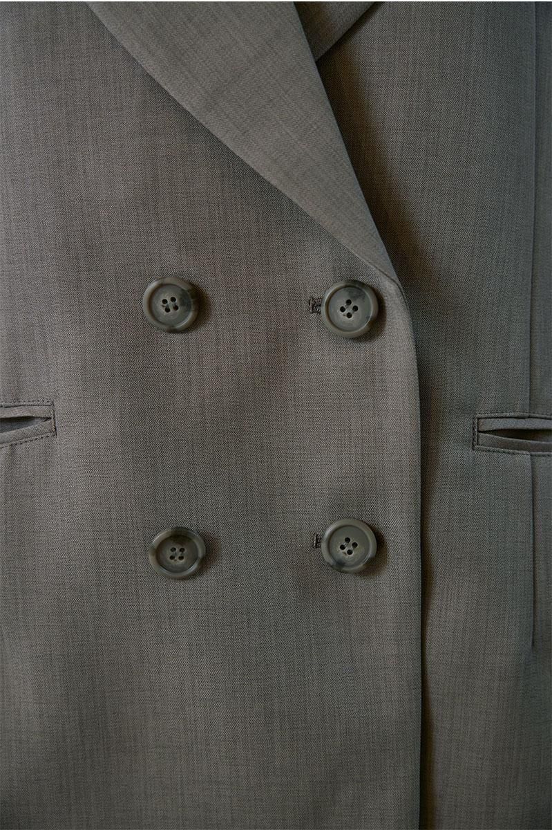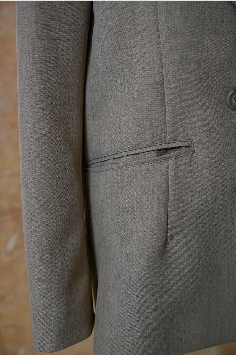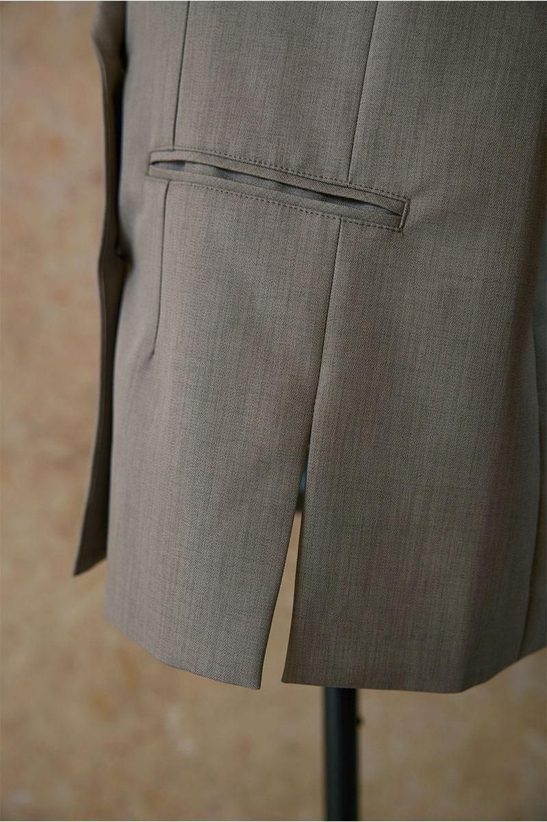 生地は梳毛調のポリエステルをメンズ規格レベルの高密度に打ち込み、ハリ感を表現しています。